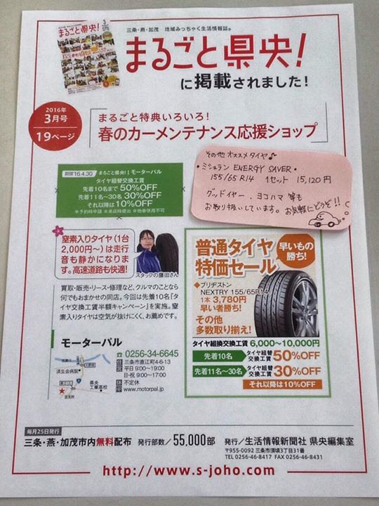 2016/2/28 投稿者:knt@kanri お知らせ お世話になっております! まるごと県央3月号はもうご覧頂けましたか? 只今モーターパルでは春のタイヤキャンペーンを実施中! 数量限定ではございますが、特価にてご提供しております。 是非ご利用ください。