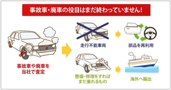 事故車だって事故の程度が良ければ査定額はそんなに下がりませんし、走行不能車両でも部品は再利用できます。